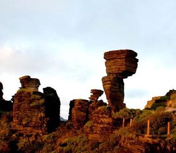 一方岩石屹立于梵净山顶崖边,高10余米,上大下小,形如蘑菇。此石大有一触即倾之势,奇险异常,然而它却顶天立地,稳稳站立若千万年。已成为梵净山的象征。