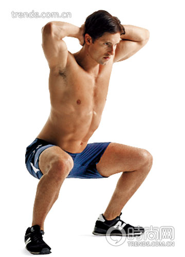 A 臀肌用力下蹲,屈膝让身体重心尽可能降低,动作不要过猛保持脊椎的正常弯曲弧度。