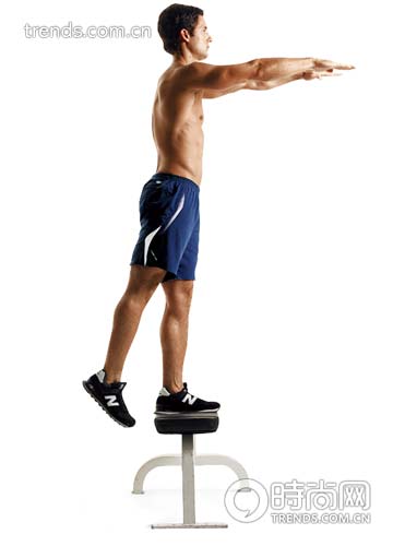 A 前脚脚后跟用力,身体重心上移,整个身体单脚踩在训练椅上,后脚悬空。