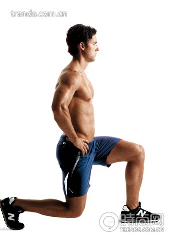 A 单腿向前跨出大步,下蹲降低身体重心直到大腿与地面平行、后腿膝盖几乎但未碰到地面为止。