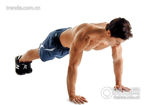 双手支撑身体,双臂垂直于地面,双手距离要比肩距小,两腿向身体后方伸展,依靠双手和两个脚的脚尖保持平衡,保持背部和双腿在一条直线上。