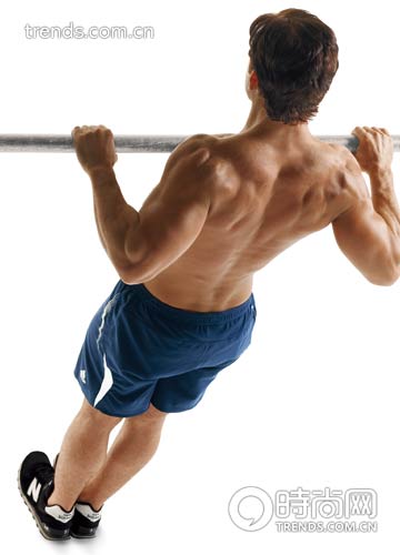 A 保持身体笔直,用背部肌肉和双臂把身体朝前上方拉,胸部触到单杠后缓缓落下。