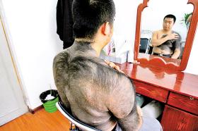 昨天中午,趁着小宋午休,记者约见了他。23岁的小宋,浓眉大眼,俊朗有型。在休息室里,小宋脱掉了紫色上衣,他的前胸立刻露出一大片黑色痕迹,上面还长有毛发,后背几乎完全被黑色痕迹覆盖,右臂和颈后毛发颜色最重。乍一看真的挺像穿着一件黑色毛坎肩。小宋笑笑:“很热,但都习惯了。小时候这胎记很痒,我挠出血了,线衣紧紧粘在身上,揭不下来了,后来用盐水浸泡才撕下来。”