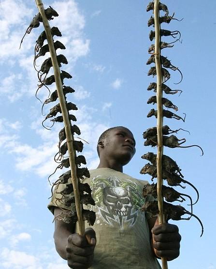 马拉维当地青年将烤好的田鼠串成串,沿街叫卖