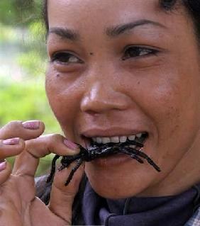 现在柬埔寨人用毒蜘蛛作佳肴宴请客人是常事了。去年记者到一处深山农场采访。农场主人特地吩咐做油炸毒蜘蛛。为了不辜负主人盛情,我壮胆拿起蜘蛛,蘸着椒盐、柠檬汁吃进嘴里,味道还不错,有点像油炸蚕蛹的味道。现在来金边的旅游者,不少人特地到街头的市场上品尝这种“蜘蛛小吃”。当地农民也因此多了一条生财的路子。
