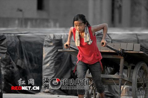 帖子一共附带15张照片,照片上一位十五六岁的女孩穿着红色短袖上衣,颈上挂着一条毛巾,脸上有着同龄孩子少有的沉着淡定,当然也有在生活重担下难得的微笑,她的父母同样忙着在砖场劳作,在砖厂拉板车的过程中,小女孩还得时不时盯着在一旁玩耍需要照料的弟妹(最小的是对双胞胎),“生活不容易,小小年纪的她不能尽情享受暑假,必须打工减轻父母的负担。 ”发帖人感叹道。