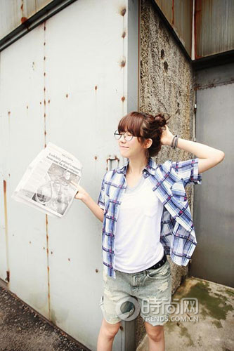 冷色系方格纹衬衣搭配做旧牛仔短裤,中性休闲风十足。