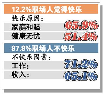 调查显示,仅12.2%的职场人觉得快乐。在表示自己快乐的职场人中,因为家庭关系和睦而感觉快乐的比例最高,达到了65.9%。其次是健康无忧,比例为51.4%。在这些能够让人快乐的因素中,显然家庭关系和睦占据了主要的位置。