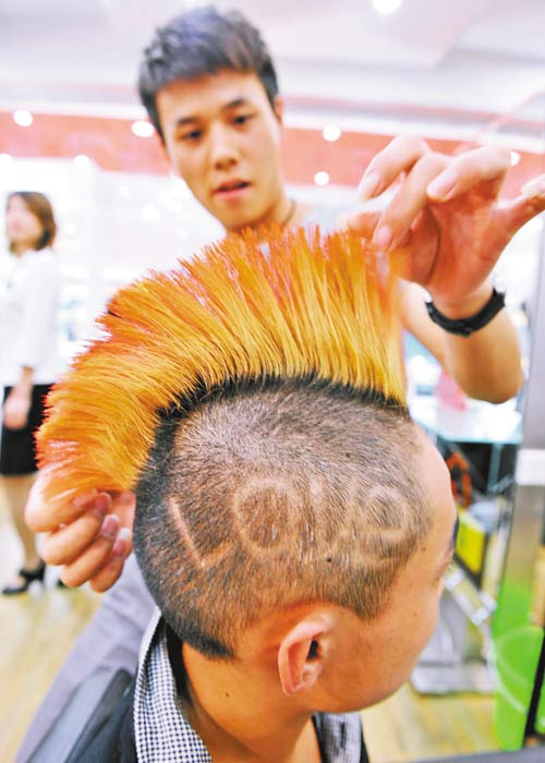 邓明辉说,他是东北人,来宁波工作两个月了。“我还没有女朋友,过两天就是七夕了,中国的情人节,所以,我就想来剃个爱情头,希望能在七夕找到自己的另一半。”(记者盛高摄)