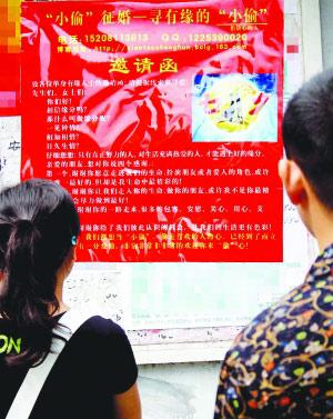 这张大红海报十分喜庆,上贴一张七夕圆月牛郎织女相会图,留下征婚者的电话号码、QQ号码及网络博客地址,另有一些真情话语。乍一看,这“小偷”征婚还真蒙混人,可走近一瞧,才发现标题上的“小偷”下面有五个小字注释:指偷心的人。