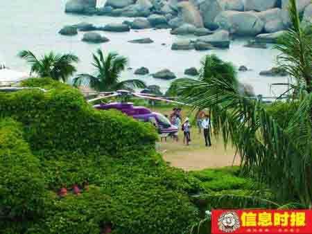 因为找不到码头在哪里,无法坐船去海岛游泳,东莞经营酒店的富豪便开着私家直升机出去游泳,直升机降落在海岛后,富豪家属在大海中畅游了将近两小时,直升机就飞离了海岛。这是记者23日下午在惠东巽寮三角洲岛所见到的一幕。
