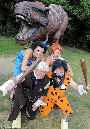 英国一对新人近日举办了一场“史上最另类的婚礼”,与众亲属一道,齐刷刷打扮成原始人的模样,特别选在恐龙主题公园中举办了一场原始人类的婚礼。