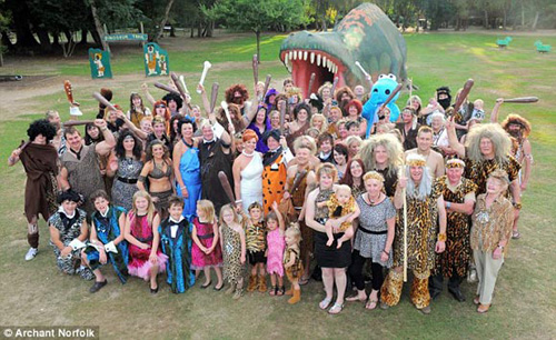 参加婚礼的亲朋好友集体合影。大家都打扮成了原始人的模样。
