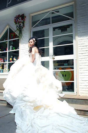 “大概在1997年底,我与新来公司的设计师莎莎一见如故,成了最要好的朋友,我们都盼着莎莎能早日穿上嫁衣。当时她打趣说,要等我和另一个姐妹生一男一女给她拖婚纱。还好,我和另一个姐妹很‘争气’,生了一男一女给她凑好了花童。今年,莎莎终于要把自己嫁出去了,我想为她准备一份珍贵而独特的贺礼——纸婚纱。准备了整整一个月,才把这套婚纱做好。”