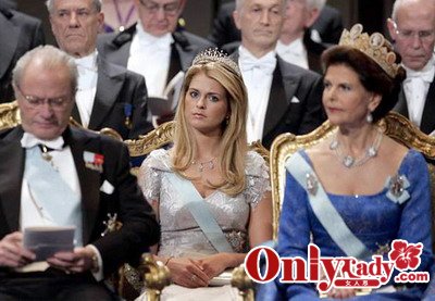 玛德莲公主有着一头柔顺的金发,二八的分发线和斜分的刘海很好的“瘦削”了脸部线条。