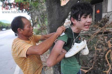 这是怎么回事?少年的父亲说,儿子是他绑的,啤酒是儿子的叔叔泼的。事情的起因是,儿子给人带路竟收了10元钱。此外,邻居把儿子“带路收钱”一事告诉他后,儿子不但不承认收钱,还朝邻居扔石头,“不这样调教,以后他就会一直走邪路。”见记者走上前,少年哭着说,他叫刘小军(化名)。前晚,一名过路的轿车司机车上没油了,他就带着这名司机去1公里之外的地方加油。这一幕被邻居刘某源看在眼里。