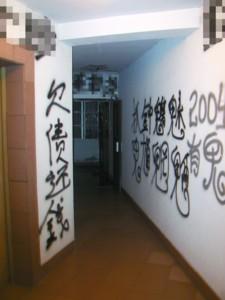 昨晚,记者在该楼20层看到,雪白的墙面上几乎被黑漆涂满了字。居民走出电梯或家门,映入眼帘的便是“杀”、“死”、“此屋有鬼”、“欠债还钱”之类的大字。2004室的铁皮防盗门已被砸得严重变形,门锁上方有一个碗大的窟窿。透过窟窿,记者发现里面似乎已多时没有人住了。