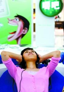 上海一些写字楼中特辟“减压房”,一名白领在此听音乐缓解工作压力 新华社发