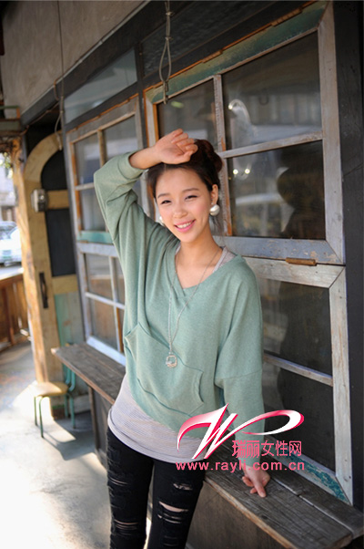 青色V领卫衣与内搭的灰色打底衫,营造出丰富的层次感,搭配黑色破旧紧身裤,混搭风范让你别有味道!