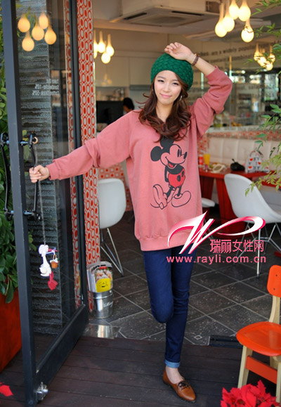 砖红色卡通印花卫衣,宽松的款式让你更显娇小,搭配蓝色紧身牛仔裤,展现你的迷人美腿!