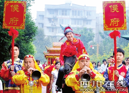 高头大马、花轿凤冠、迎亲唢呐……一场热闹喜庆的中式婚礼吸引了众人的眼光。昨日上午,在成都沙河公园,成都小伙侯俊用这样的方式迎娶重庆新娘税嘉。婚庆公司策划人曾真说,随着中秋即将来到,国庆大假期间不少新人放弃了婚纱香槟下的西式婚礼,采用传统中式习俗。