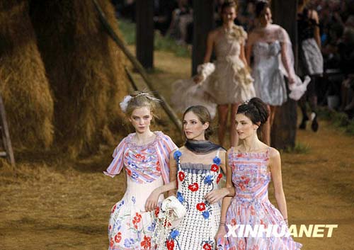 10月6日,模特在法国巴黎展示德国设计师卡尔·拉格费尔德为香奈儿(Chanel)设计的春夏新品。在本次2010巴黎春夏时装周上,香奈儿将清新的田园风格融入了新一季的作品中。新华社记者张玉薇摄