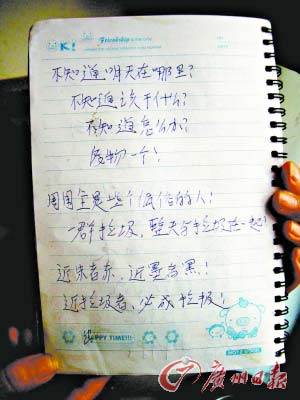 家人在姚杰宿舍找到一个笔记本,上面歪歪斜斜地写着姚杰的一些话:“讨厌的小偷,干吗偷我手机”、“讨厌被人可怜!讨厌一切”、“一群垃圾,整天与垃圾在一起”等。