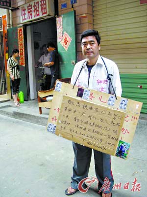 昨日上午,姚贵福在大朗镇黎贝岭综合市场附近身挂牌子寻子,他称:“如果找不到儿子,我也不想活了。”