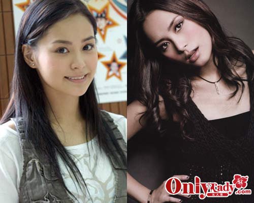 妆容点评:阿娇同样是出了名的素颜美人,淡妆非常清纯可爱,很有学生气。浓妆后的她更加成熟富有女人味,细长的眉一扫原有的稚气,圆型的可爱眼睛,在上、下眼尾以黑色眼线及深棕色眼影拉长,变的性感妩媚。