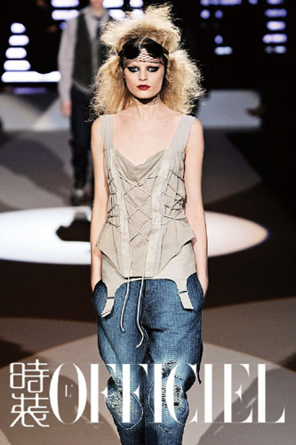 当然牛仔总是能拯救品牌于水火之中,在不景气的经济形势下更是成为品牌转型的救命稻草,看一向以野性性感著称的Roberto Cavalli先是让自己的主线转型摇滚,后又让牛仔贯穿自己的副线。而一向善用蕾丝、绸缎打造清透可人形象的Bluemarine也将矛头指向了丹宁布,为了将品牌精神在丹宁布上体现出来,镶满亮钻,蕾丝的Skinny诞生了。
