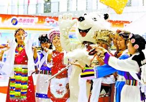 西部美女与吉祥物嬉戏,“2009魅力中华畅冬游”正式开幕。记者张伟清摄