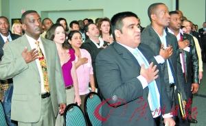 ▲美国一个州的新移民正在举行宣誓入籍仪式。