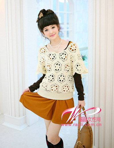 米色镂空编织衫带有一丝民族气息,搭配黄色宽松裙裤,亮眼的色彩十分吸引眼球!