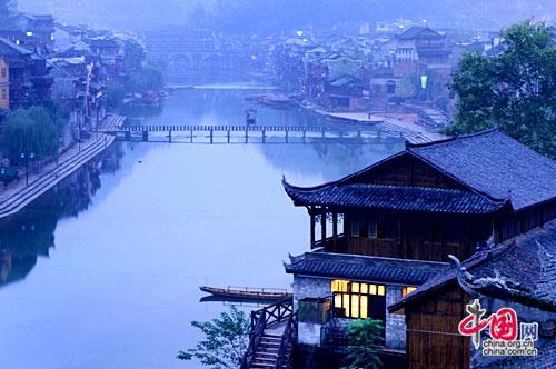 读过《边城》的人都对翠翠和翠翠生活的地方留下了美好的想象:翠翠清澈如水的性情和恋情,乡民朴实旷达的作风,月光下水边的吊角楼等等。《边城》是自称为“乡下人”的沈从文所作,写的就是湘西的凤凰县。 凤凰县位于吉首市与怀化市之间偏西的地方,城区傍沱江而建,沱江如酒,沿江的吊角楼就如美人醉酒一样憨态可掬。城内大街小巷中辣子与熏肉的香味四季飘香,多情湘女,婆娑而过。有月光的晚上,苗民男女的对歌声可惊醒每一扇临水的窗户。出了城,见一山如利剑穿空,拔地而起,曰天星山。进山,再见斧削刀砍的绝壁中一清溪婉转。跨过清溪,登栈道,古树夹道,怪石峥嵘。上山顶,一平台豁然开朗,中有一方池为“天池”,汩汩溪流,却久旱不涸,常有麝獐叹水,百鸟低回。下得山来,性犹未尽,去奇梁洞。沿溪水入洞,洞内有云雾山、天堂、龙宫、阴阳河等景,收桂林、张家界奇景于一洞。出洞入江,可再去看湘西最大的瀑布大龙洞和黄丝桥古城。