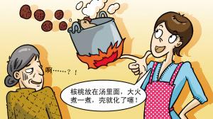 如今,王大爷和王大妈每天吃饭,都不忘为女儿女婿讲解当日菜肴的制作程序和方法。“免得他们继续闹笑话。”尽管如此,知情的亲朋和同事碰到王燕夫妇就忍不住开玩笑问:“你们的核桃炖熟了吗?”“核桃不去壳炖鸡汤的味道如何?”