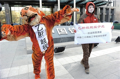 昨天中午,多名乙肝病毒携带者与维权志愿者一道,在中国铁建大厦门口,抗议此前在陕西渭南发生的中铁二十局技工学校招生过程中的乙肝歧视事件。