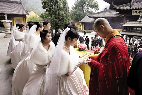 近日,30对新人在浙江省诸暨五泄景区内的千年古刹—禅寺参加佛教集体婚礼,新人们在佛前祈祷,并接受了禅寺主持的高香祈福。