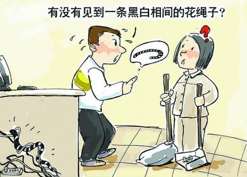在走廊遇到清洁工阿姨,哪里敢问“你看到一条蛇了吗”,只能说:“有没有……嗯,有没有见到一条黑白相间的花绳子?”