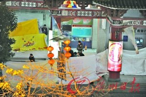 昨晚8时50分许,佛山市禅城区东方广场德胜楼东南角前有近十辆警车停靠。在一楼某银行营业厅门前的台阶上,一人多高的布将这里团团遮围起来。
