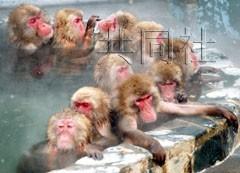 猴子们泡在热气腾腾的温泉里互相梳毛,十分悠闲,有的猴子舒服得昏昏欲睡。