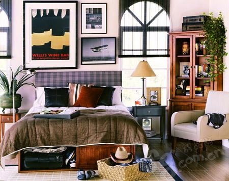 Copy:即使对称码放的床头柜也绝不趋同,黑色边桌上的土黄色台灯和相框与棕色台面上的古铜花器让二者的颜色有了自然过渡。