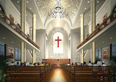 西堂在西直门内大街南侧,是这四座堂中的小弟弟,始建于1723年,1912年重修。因毗邻的药厂未能迁出,所以在大街上几乎看不出它的模样来。然而室内精美的科林斯柱子及哥特式的尖拱券,使堂内高大雄伟而不失秀丽。
