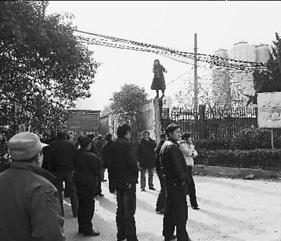 目击者高先生称,上午9时许,这名女子爬上啤酒厂围墙,手里拿着药瓶,不停地大喊让啤酒厂经理出来说话,厂方称领导出差无法来到现场,该女子对谁的劝说都不听。这名女子姓张,东西湖柏泉人,曾在这家啤酒厂上班,因对厂方一些做法不满,站在围墙上以喝毒药为由要挟。