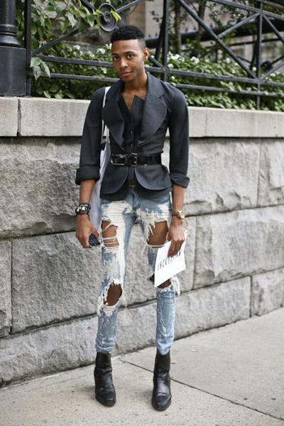 这个破洞牛仔还真是已经破到了一定程度了!再加上一双高跟鞋,掐腰西装!这不是中性化,这是绝对的女性化!