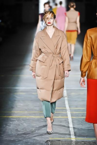 DriesVanNoten一直以来都以实穿为基础。他高雅的时尚理念将归结于简单的细节,例如一件轻松可穿的宽松外衣套在衬衫外。上半身的领子和廓形都沿承了大衣的的款式,突破了羽绒服固有的拉链装,羽绒服也可以像这样重叠,上半身丝毫不显臃肿,突出腰身,DriesVanNoten用他的设计和工艺证明简单的一件式也可以变化多端。