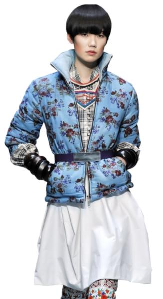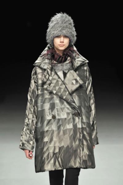 羽绒服的填充物料充满膨胀感,不适合玩层次,虽然市面上也有如“圣衣”般层次丰富的羽绒衫,但若不想要LadyGAGA那般戏剧化的形象,请勿轻易尝试。在基本款的羽绒服上玩图案,是最省心也最出效果的方式,再为这身花衣裳添置些主题统一的保暖配饰即可。IsseyMiyake将羽绒服做成大衣款,配上俄罗斯风情的皮草雪帽及围脖,保暖系数100%,羽绒服的衣身图案选择了如钻石及冰块的棱镜折射效果,则多少有些“冰美人”的味道。当红日本超模TAO演绎的这身Peter Jensen也是在衣身图案及搭配方式上做文章。虽然下搭纱裙可以忽略,但腰带的运用还是很值得借鉴的,换副及肘皮手套取代叠戴手镯,收出手臂线条。