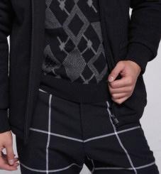 (对:灰黑色调的菱格与细线勾勒出的大方格长裤搭配,为简洁的外观增添了结构感。)