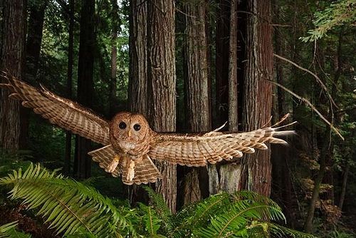 在一片年轻的红杉林地中,一只猫头鹰从我们的镜头前掠过。