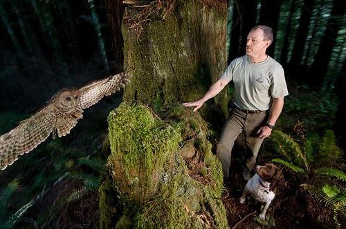 加利福尼亚州北部,麦德河沿,来自绿钻资源公司(Green Diamond Resource Company)的高级生物学家罗尔·瑞尔和他的“小助手”莱利正利用一只老鼠吸引加州北部猫头鹰前来。在90年代早期的次生林中,瑞尔和其它研究者一道,发现了这一濒危物种。