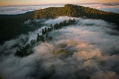 余晖下,绵延的雾气和高耸的山脊勾勒出加州洪堡红杉国家公园的轮廓。这里滋养着大片的原始森林,公园的远端则由那些更为年轻的次生林覆盖。这里,水汽扮演着至关重要的角色,红杉所需水分的三分之一,都需要从雾水中汲取。